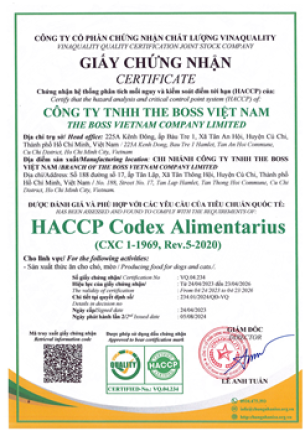 Sản phẩm được sản xuất từ nguyên liệu chọn lọc, đảm bảo an toàn thực phẩm và đạt tiêu chuẩn quốc tế. Đặc biệt, sản phẩm còn được Trung tâm Giám định và Chứng nhận Hợp chuẩn Hợp quy VietCert kiểm tra và đánh giá định kỳ hàng năm nhằm đảm bảo chất lượng ổn định và đáng tin cậy, giúp khách hàng hoàn toàn yên tâm về sự an toàn và hiệu quả dinh dưỡng cho thú cưng.
