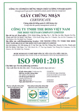 + Đạt các chứng nhận quốc tế về quản lý chất lượng sản phẩm, an toàn thực phẩm như: ISO 9001:2015 & HACCP.